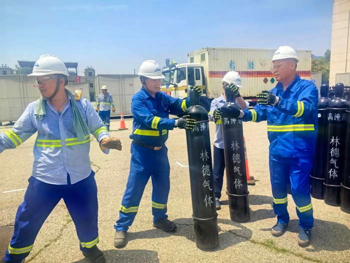 為了在規(guī)定時(shí)間完成相關(guān)任務(wù),北普公司將全部人員分成若干工作小組,組長(zhǎng)都是由多次參加重大活動(dòng)保障任務(wù)的老員工擔(dān)任,小組的主要任務(wù)是在規(guī)定時(shí)間內(nèi)將鋼瓶推放并綁定在指定位置,裝表、聯(lián)管、上槍、調(diào)壓,充氣作業(yè),巡視、加壓、換瓶,一個(gè)個(gè)規(guī)范動(dòng)作都責(zé)任到小組到個(gè)人,目標(biāo)只有一個(gè),配合協(xié)作單位在規(guī)定時(shí)間內(nèi)完成罐裝,以最安全的方式、最快的速度將現(xiàn)場(chǎng)高純氦氣鋼瓶撤出,確保特制移動(dòng)籠房能夠準(zhǔn)時(shí)出發(fā)。
